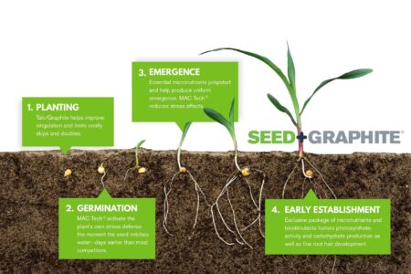 SEED+GRAPHITE® is a nutritional seed treatment that improves germination, crop emergence, seedling vigor, and plant tolerance under abiotic stress, leading to higher yields. With a full nutrient package to establish a strong start and biostimulants to mitigate abiotic stress, SEED+GRAPHITE helps crops push through environmental variability to maximize yield potential. A blend of talc+graphite enables excellent seed lubricity and placement through nearly every planter delivery system. SEED+GRAPHITE is certified for organic use.